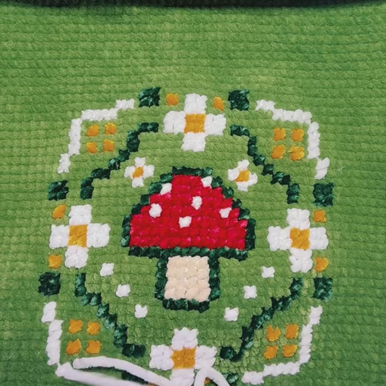 This roomy tote is handmade with soft yarn and detailed cross-stitch work, featuring a bold red mushroom design surrounded by floral and forest-inspired patterns! The back is a solid green crochet. :)