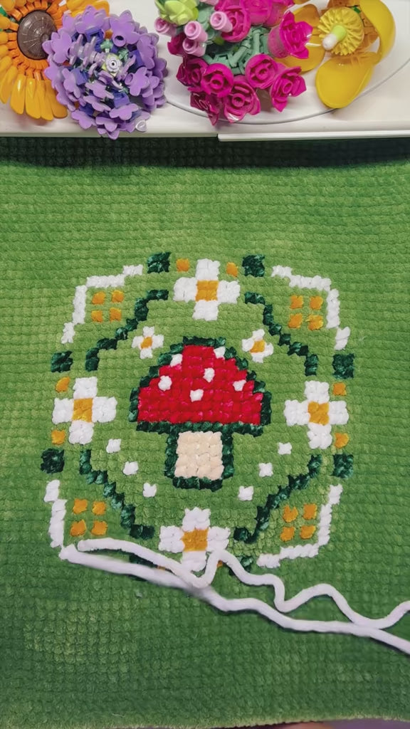- 🧵 Materials: crocheted base with hand-stitched pixel-style mushroom design