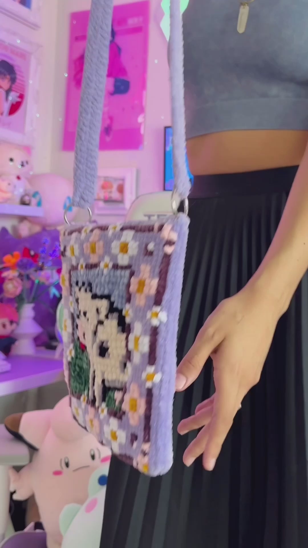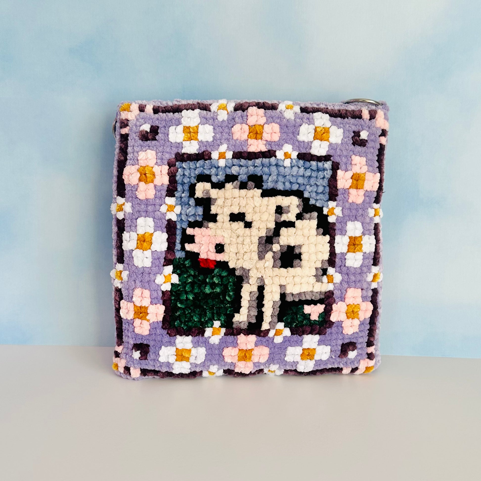 Crafted from lavender velvet yarn, this square bag features white and pink flowers and a handcrafted cow design. :)
